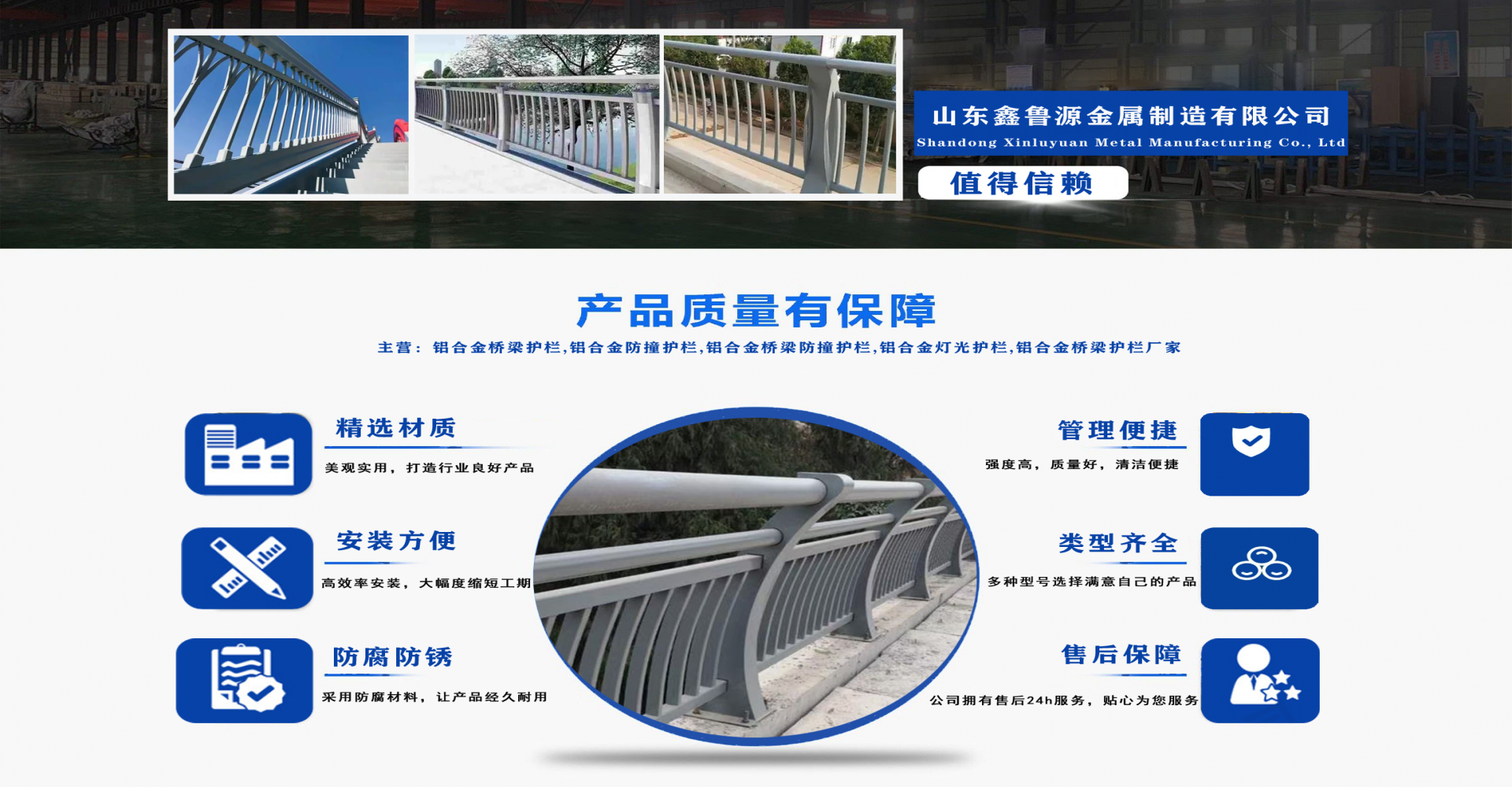 山東鑫魯源金屬制造有限公司主要經(jīng)營:鋁合金橋梁護(hù)欄,鋁合金防撞護(hù)欄,鋁合金橋梁防撞護(hù)欄,鋁合金燈光護(hù)欄,不鋁合金橋梁護(hù)欄廠家,環(huán)波梁橋梁護(hù)欄,環(huán)波梁防撞護(hù)欄。質(zhì)量可靠、經(jīng)濟(jì)實(shí)用的顯著特點(diǎn)。公司為客戶提供可靠售后保障,堅(jiān)持“以品質(zhì)立足、服務(wù)求發(fā)展”,愿與各界朋友精誠合作、攜手發(fā)展!  服務(wù)優(yōu)勢:真誠的服務(wù)理念、完善的服務(wù)體系。公司專業(yè)力量充足;工程案例眾多、從業(yè)經(jīng)驗(yàn)豐富;公司以可靠質(zhì)量的產(chǎn)品,合理的價(jià)格,完善的售后服務(wù),能夠滿足市場各個(gè)企業(yè)的需求。  企業(yè)精神:執(zhí)著追求 持續(xù)創(chuàng)新執(zhí)著追求,就是堅(jiān)持不懈、堅(jiān)定從容,專注于自己的事業(yè),把能做的事情做好,不斷克服困難、把握機(jī)遇,贏得未來。  持續(xù)創(chuàng)新,就是生命不息、創(chuàng)新不止,通過持續(xù)實(shí)施技術(shù)創(chuàng)新、管理創(chuàng)新、市場創(chuàng)新,獲取持續(xù)的競爭優(yōu)勢。...